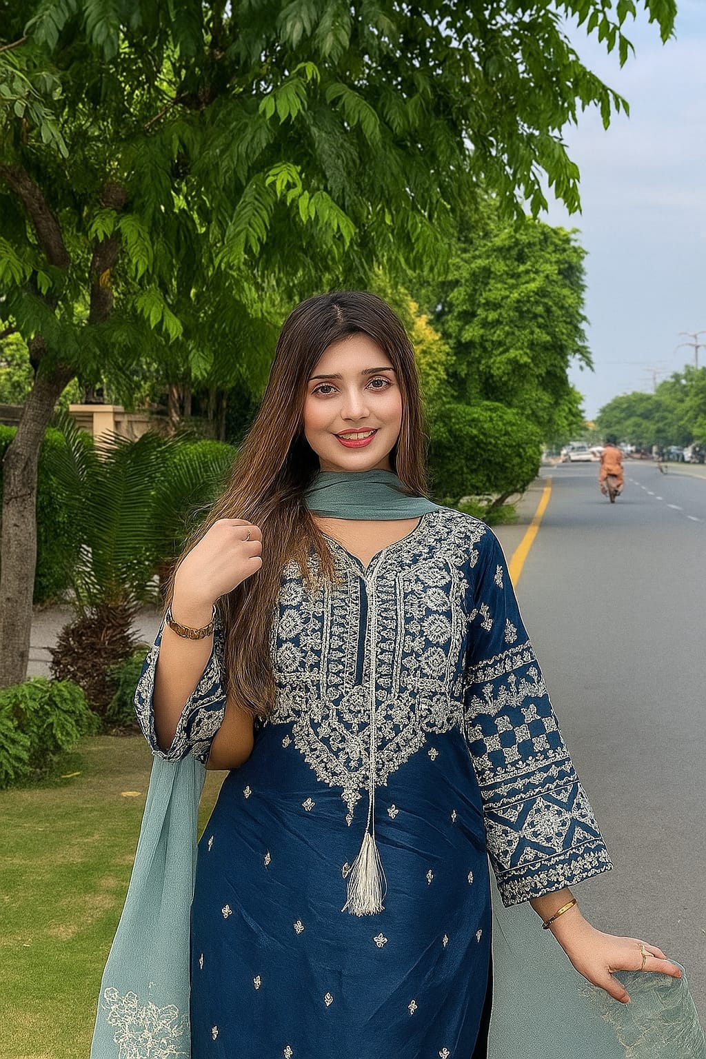 This 3-piece kurta set exudes elegance with intricate